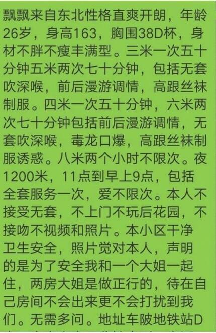 以上信息为网友分享,请在消费时自行判断谨慎消费。出现虚假信息和诈骗信息请站内短信给艾欧利雅:方法一:点击给艾欧利雅发短信——方法二:点击给艾欧利雅发短信 【寻欢时间】:2016年11月 【寻欢地点】:天河 【信息来源】:网络 【服务项目】:很多 【妹妹数量】:没问 【环境设备】:该有都有 【营业时间】:自行联系 【价格一览】:看图 【安全评估】:70 【服务星级】:★★★★ 【重点推荐】:豪爽,腼腆,温柔 【联系方式】: