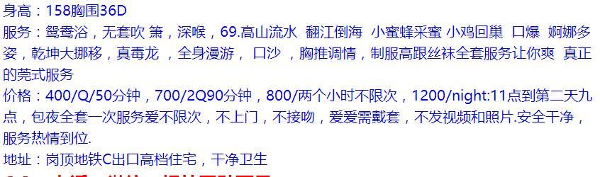 以上信息为网友分享,请在消费时自行判断谨慎消费。出现虚假信息和诈骗信息请站内短信给艾欧利雅:方法一:点击给艾欧利雅发短信——方法二:点击给艾欧利雅发短信 【寻欢时间】:2016年11月 【寻欢地点】:看图 【信息来源】:网络 【服务项目】:很多 【妹妹数量】:没问 【环境设备】:该有都有 【营业时间】:自行联系 【价格一览】:看图 【安全评估】:70 【服务星级】:★★★★ 【重点推荐】:豪爽,腼腆,温柔 【联系方式】: