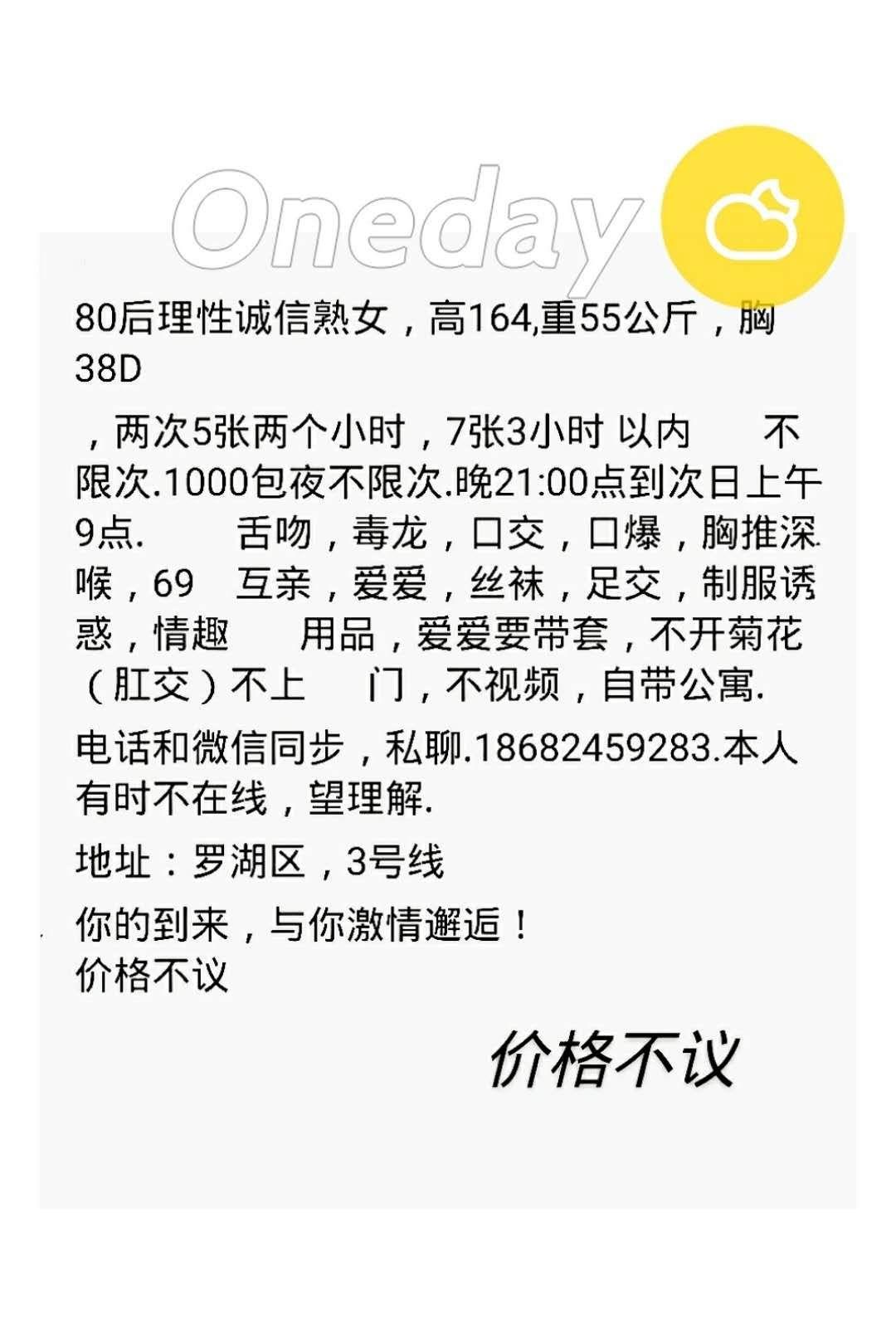 【寻欢时间】:2017年12月2日 【寻欢地点】:罗湖翠竹地铁站附近 【信息来源】:论坛狼友推荐 【服务项目】:鸳鸯浴,漫游,胸推,69式,口活,爱爱、情趣内衣 各种情趣道具 【妹妹数量】:1个 【环境设备】:自己租的公寓 【营业时间】:微信或电话联系预约 【价格一览】:500/2P两小时 700/3小时无限 1000包夜 【安全评估】:98 妹子家里遥控上门 楼下门口要密码才能进 【服务星级】:★★★★(最高5星)应适当评价质量 【重点推荐】:服务超好 态度超好 可以见面满意后先做后付款 【联系方式】:[unfree]手机:18682459283,微信:f2-7-3-8[/unfree] 【寻欢细节】: