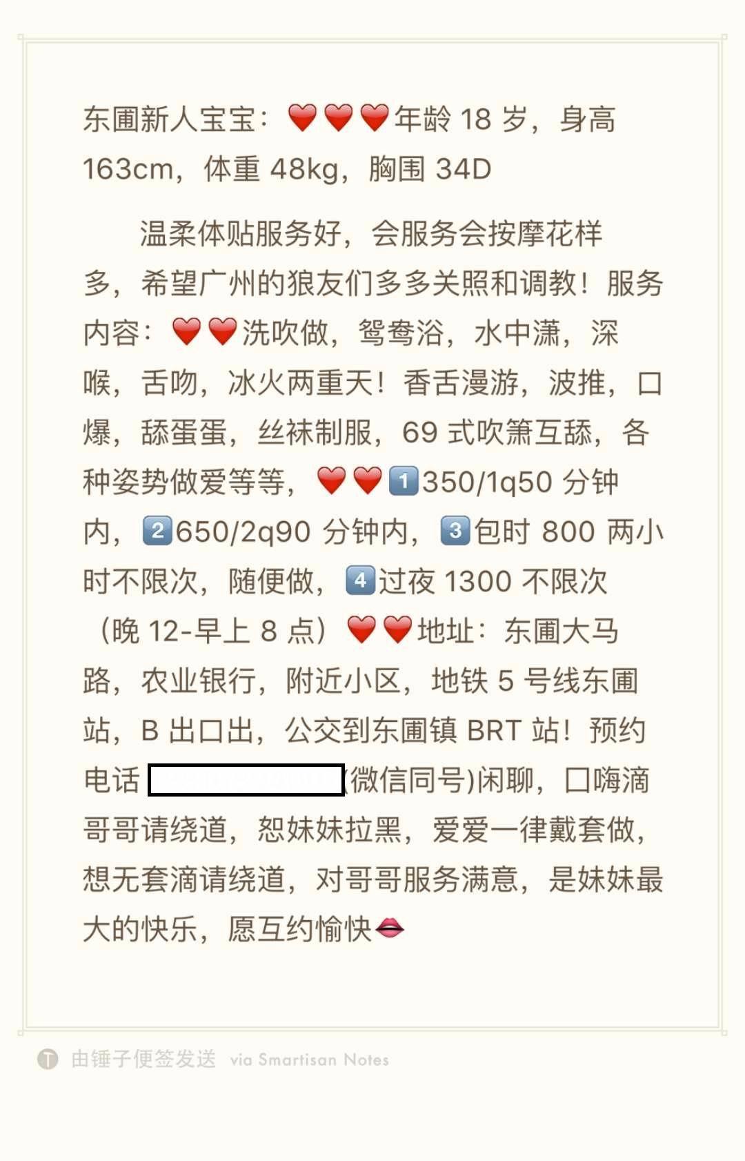 【寻欢时间】:2018年01月32日 【寻欢地点】:广州 【信息来源】:一楼风朋友圈推荐的 【服务项目】:鸳鸯浴,胸推,69式,口活,爱爱、 【妹妹数量】:1 【营业时间】: 【价格一览】:350/Q 【安全评估】:待验证 【服务星级】:★★★ 【重点推荐】:18岁,童颜巨乳,22号刚上岗几天 【联系方式】:[unfree]18816894007[/unfree] 【寻欢细节】:未试过,待补充 【附带照片】: 【验证截图】:
