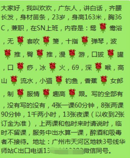 以上信息为网友分享,请在消费时自行判断谨慎消费。出现虚假信息和诈骗信息请站内短信给艾欧利雅:方法一:点击给艾欧利雅发短信——方法二:点击给艾欧利雅发短信 【寻欢时间】:2018年4月 【寻欢地点】:天河 【信息来源】:网络 【服务项目】:很多 【妹妹数量】:没问 【环境设备】:该有都有 【营业时间】:自行联系 【价格一览】:400 【安全评估】:70 【服务星级】:★★★★ 【重点推荐】:豪爽,腼腆,温柔 【联系方式】: